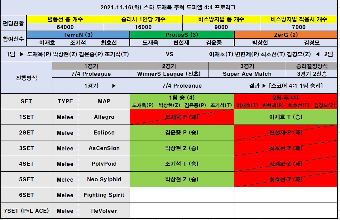 2021.11.16 (화) 스타 도재욱 주최 도피엘 4:4 프로리그 결과+전적 (조기석) 68 카비르 0 2144 2021.11.17 00:20 날짜 2021-11-16 승자1 도재욱(\700,000) 승자2 박상현(\1,600,000) 승자3 김윤중(\1,600,000) 승자4 조기석(\1,600,000) 승자5 (\0) 패자 이재호 변현제 최호선 김경모 조기석선수 슈퍼에결승리 하였습니다. MVP!!버스방지 도재욱1인당 16000개 걸린 프로리그였습니다.