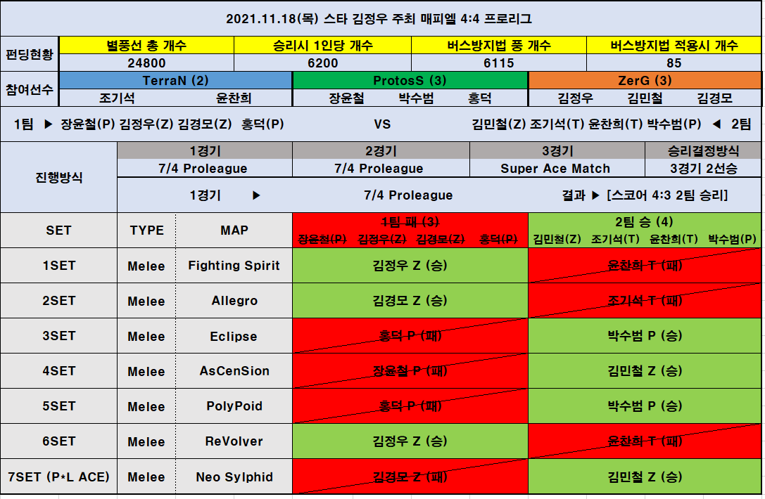 2021.11.18 (목) 스타 김정우 주최 매피엘 4:4 프로리그 결과+전적 (김민철) 68 카비르 2 1876 2021.11.19 01:09 날짜 2021-11-18 승자1 김민철(\620,000) 승자2 조기석(\620,000) 승자3 윤찬희(\620,000) 승자4 박수범(\620,000) 승자5 (\0) 패자 장윤철 김정우 김경모 홍덕 윤찬희 선수 슈에승리하였습니다. 홍덕, 윤찬희 선수 프로리그 5패 달성하였습니다.3승 김민철 MVP!!프로리그 개인전 5패 기록명단1번째 - 한두열2번째 - 이예훈3번째 - 김정우4번째 - 윤찬희5번째 - 홍덕
